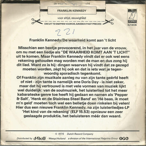Franklin Kennedy - De Waarheid Komt Aan 't Licht (7", Single) Format: 7", SingleYear: 1975